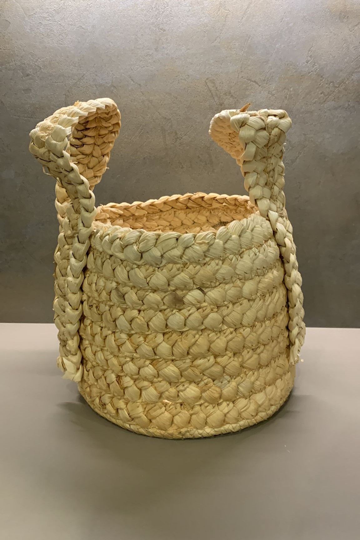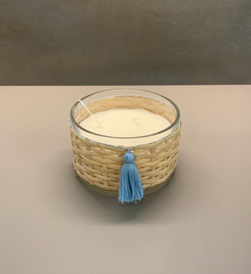 OrdinaCandela in contenitore di vetro, rivestita in fibre naturali con nappina azzurra.
