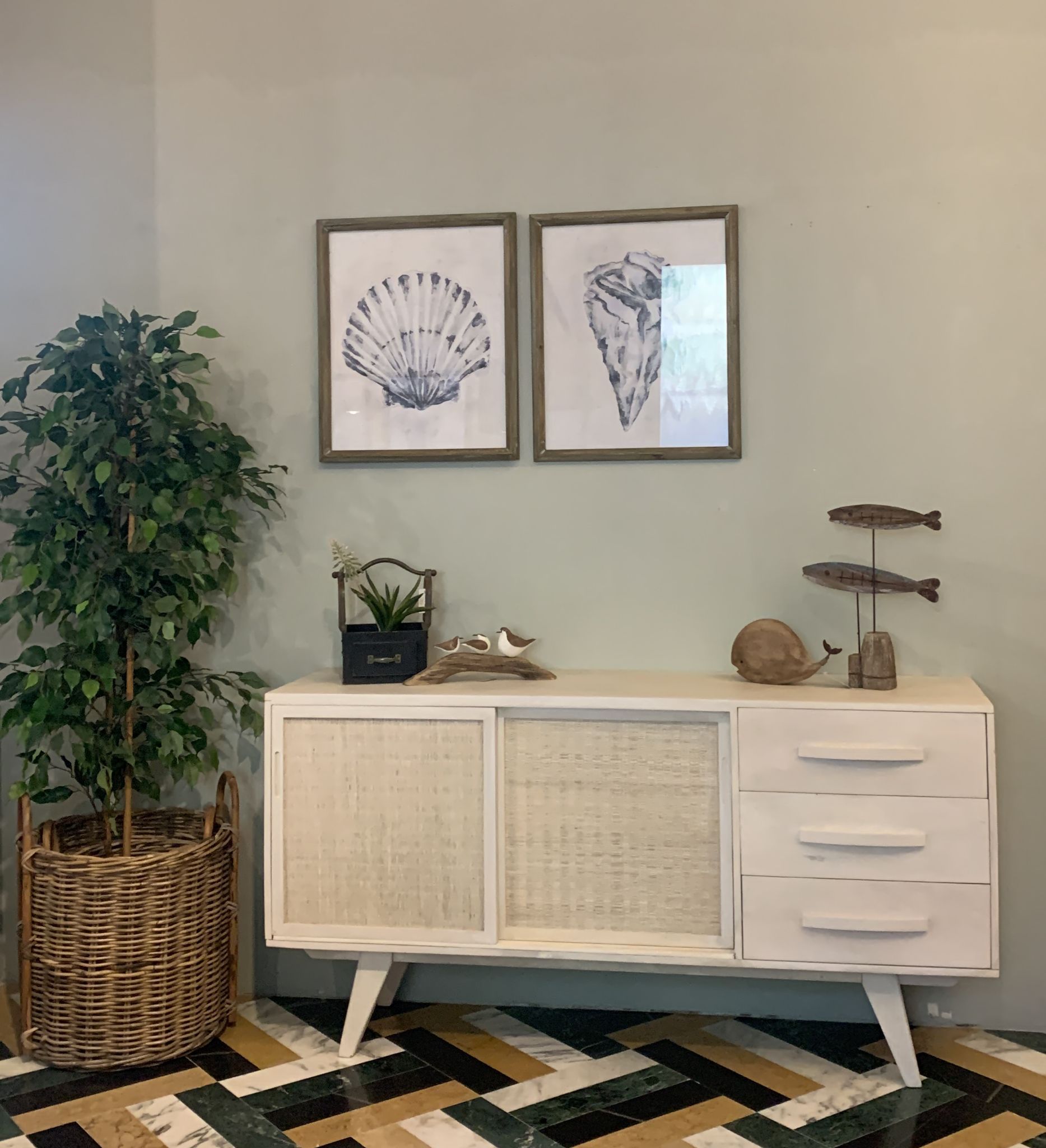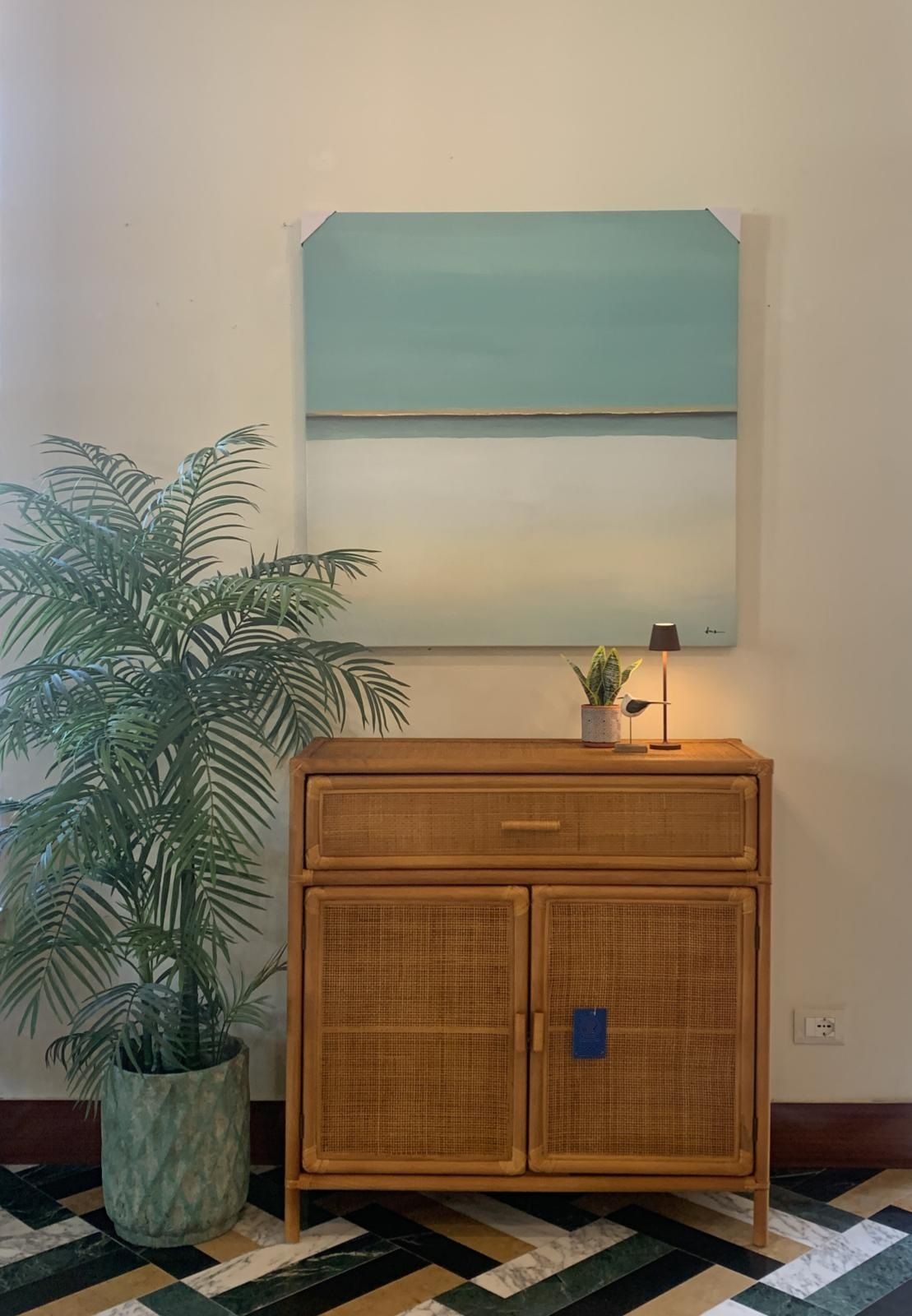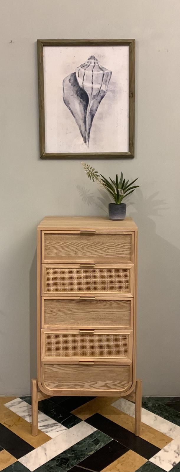 Madia con due antine scorrevoli e tre cassetti, realizzata in mango e rattan, verniciato bianco shabby.