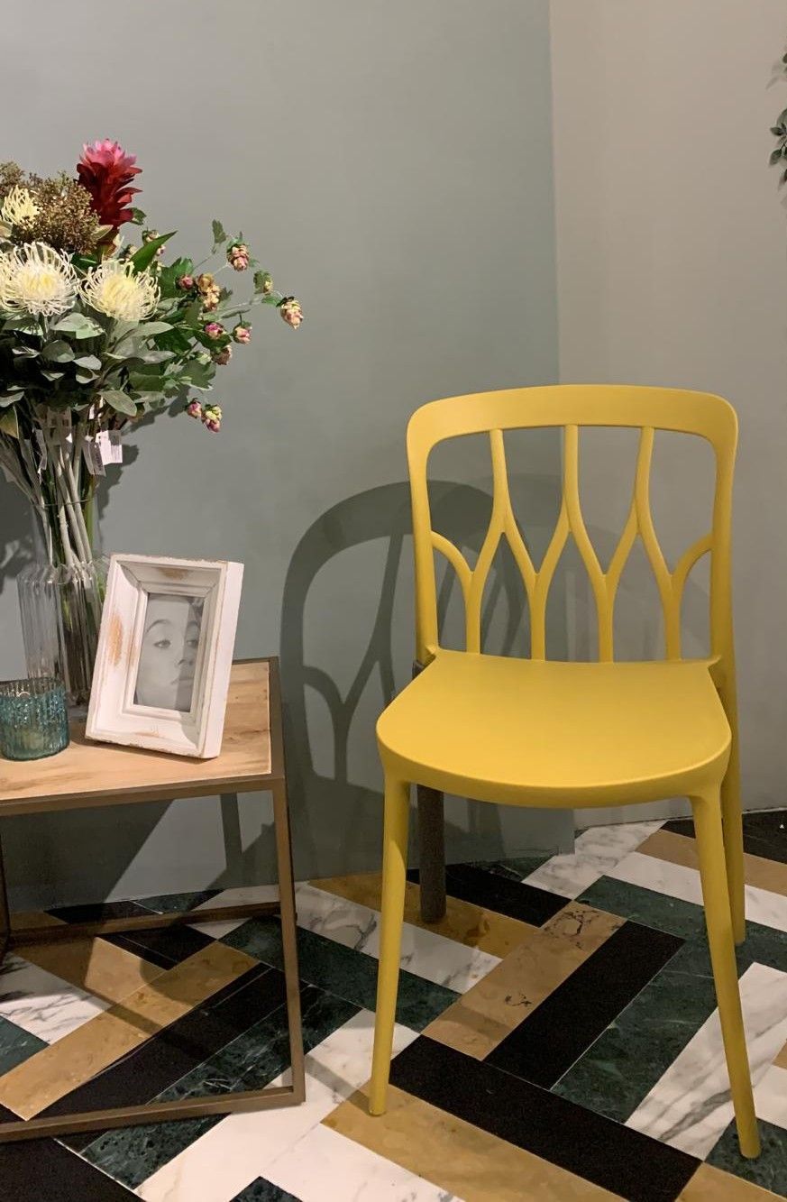Sedia in polipropilene colore giallo senape, impilabile.